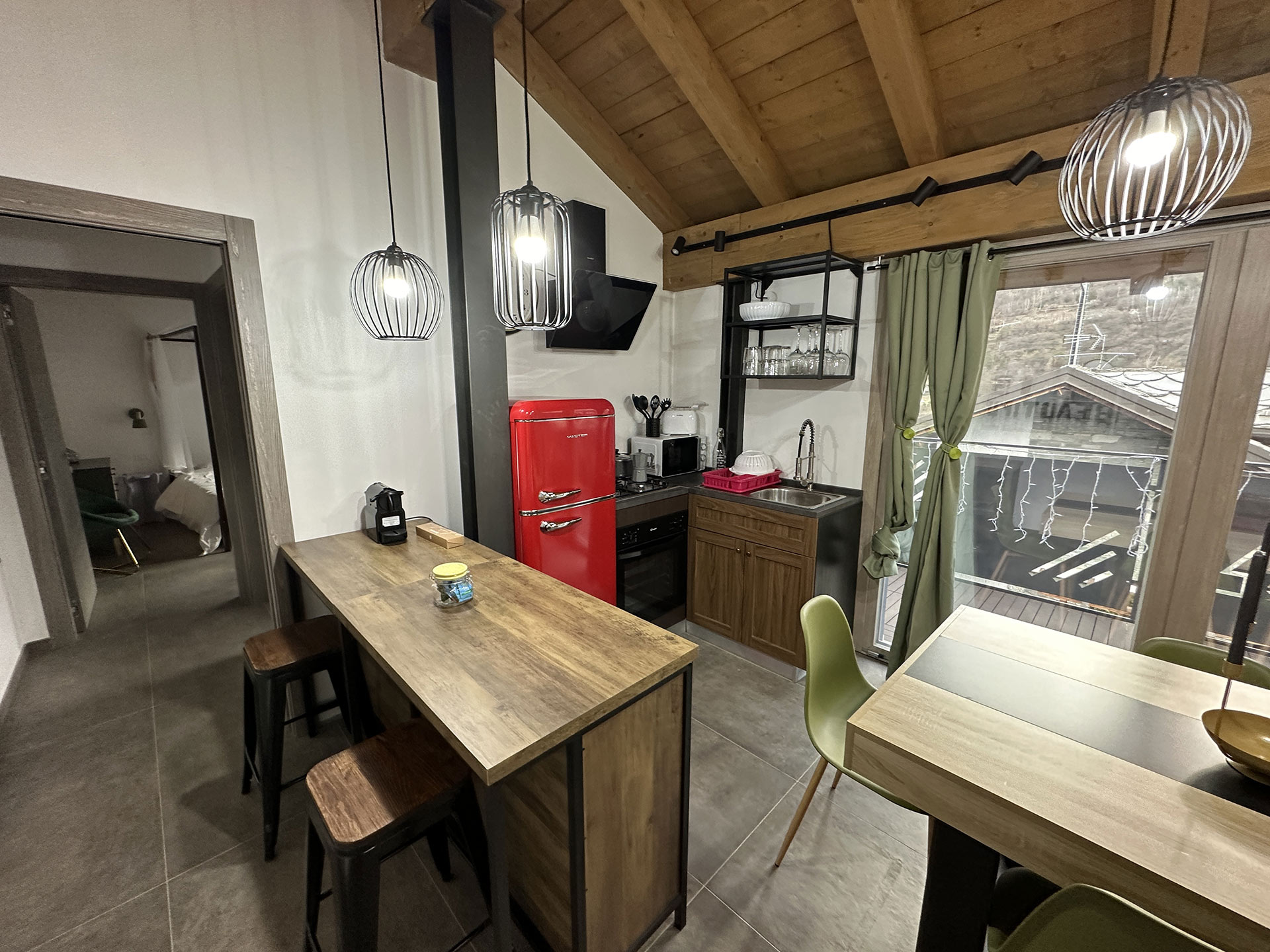 Industry Apartment is arranged over two levels with a stone staircase. It is located on the third and top floor with exposed beams. Just inside the entrance of the apartment, you’ll find the first double bedroom with a two-person whirlpool bathtub, ideal for pampering yourself after a day exploring the wonderful Valle D’Aosta. Going up to the top floor, there is a large living room with a sofa bed and kitchen with access to a spacious terrace with breathtaking views of the Aosta Valley mountains.